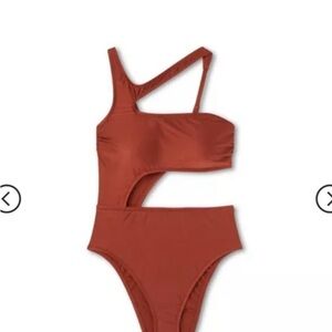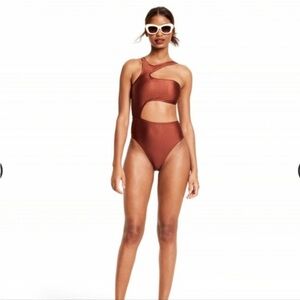 Fe NOEL Women's Asymmetrical Metallic Cut Out High Leg Cheeky One Piece new