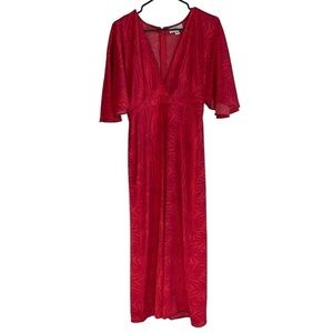 This Palm Leaf Contrast-Print Exaggerated Flutter-Sleeve Maxi Dress from Fe Noel × Target brings effortless style & charm to your wardrobe. Adorned with allover palm leaf contrast print, this fuchsia dress is designed with a splice V-neckline, short exaggerated flutter sleeves, and a shapely waistline with front and back darts. It's made from soft, midweight fabric with a maxi length and a zipper fastening across the back.