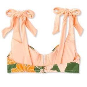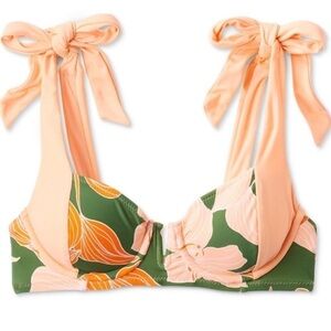 Style a stunning swim look with this Lily Floral Print Underwire Bikini Top from Fe Noel x Target. Made from soft and stretchy fabric, this underwire bralette bikini top is designed with a pretty allover lily floral print in a peach and dark olive color palette. The bikini top features two tie-fastening shoulder straps in solid peach, plus a back hook closure for a secure fit.