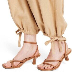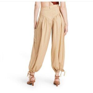 Yoke Pants from Fe Noel x Target, you can look good and feel comfortable all day. These solid khaki pants are defined by a V-yoke at the front and back, a gathered wide-leg silhouette and side-tie ankles. They are tailored with a side patch pocket, a fly zipper and a high-rise waist with belt loops. Midweight linen-blend construction with a casual fit completes the design.