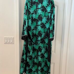 Add some tropical flair to your swim look and beyond with this Feathered Palm-Print Cover-Up Dress from Fe Noel x Target. It's adorned with an allover feathered palm print in green against a black background, with an open-front silhouette, a belted waist and long sleeves. It's made from comfortable 100% recycled polyester with a maxi length silhouette and high slits on the sides.