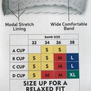 S= 32-34B & 32-34C M=34-36B, 32-36C & 34-36D L= 36-38B, 36-38C & 36-38D XL=38-40C & 38-40D