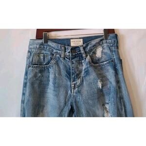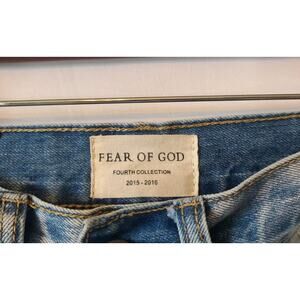 The Fear Of God Fourth Collection Mens Distressed Selvedge Jeans in size 29 feature a solid blue color with a light fabric wash, made of cotton denim material. These regular fit jeans have a low rise, button closure, and zip ankle detail. The skinny style and distressed features give them a unique and edgy look, perfect for men who want to make a bold fashion statement.