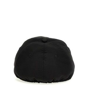 Fear of God presents a refined black nylon baseball cap with a distinctive leather logo patch on the front. This cap is designed with a structured brim and an elastic back for a comfortable and secure fit, making it perfect for casual and streetwear styling.