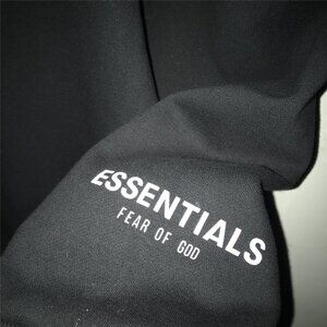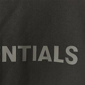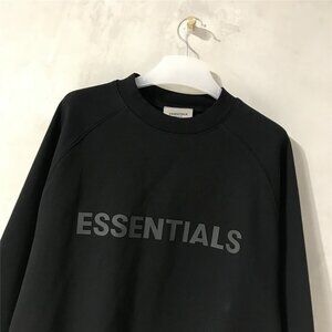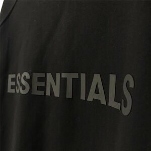 Loose crew neck fit for comfort, black cotton fabric, with tonal "ESSENTIALS" printed on the front.