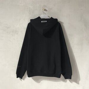 Loose hooded fit, black cotton fabric, with the word "ESSENTIALS" printed in the same color on the front, and the brand logo on the cuffs. The hooded design is paired with a kangaroo pocket on the chest.