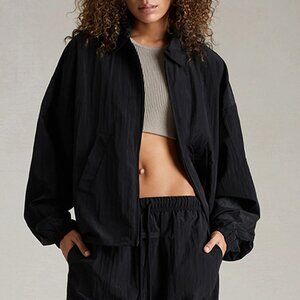 Crinkle Nylon Shell Bomber Jacket made from stretch woven nylon fabric. It features a cropped and rounded silhouette, a classic shirt collar, a rubber brand label at the upper back, a full zipper front closure, and a toggle bungee elastic hem for a customizable fit. Oversized, boxy fit that Essentials is known for. In great condition, only worn a few times.