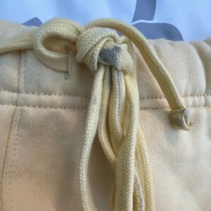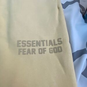 Fear of God ESSENTIALS collection Logo Jogger Sweatpants in Light Tuscan Yellow Fleece. Designed by Jerry Lorenzo, these sweatpants stand out with their classic cut and unique color.