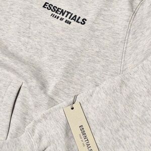 Authentic Fear of God Essentials hoodie in the Light Heather Grey colorway.