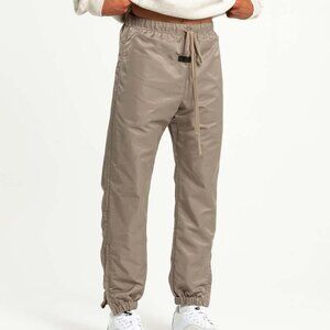 Upgrade your wardrobe with these sleek desert taupe track pants. Designed with a modern, minimalist look, they feature an elastic waistband with long drawstrings, tapered legs, and elastic cuffs for a comfortable, secure fit. The smooth, lightweight fabric gives them a polished finish—perfect for casual wear, athleisure, or travel. Stylish, versatile, and easy to pair with any outfit.