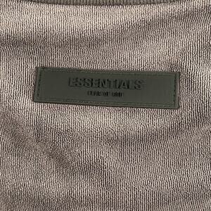 Branding/Logos: Tonal "ESSENTIALS" print on sleeve; rubberized back patch reads "ESSENTIALS FEAR OF GOD"; interior neck label "ESSENTIALS"