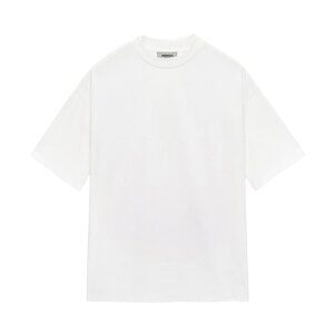 Classic white tee with bold black 'ESSENTIALS' print. Short sleeves. Minimalist design.