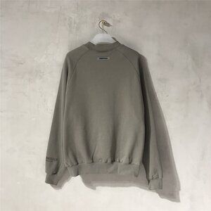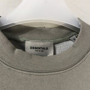Loose crew neck fit for comfortable wear, grey-green cotton fabric, black "ESSENTIALS" printed on the front, brand logo on the cuffs, simple and stylish crew neck design.