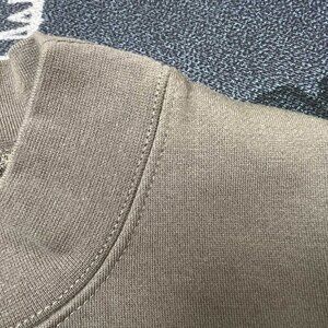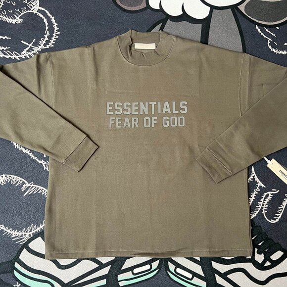 Brand new with tag. This khaki turtleneck sweatshirt features a grey "ESSENTIALS FEAR OF GOD" print on the front. The turtleneck design and relaxed fit create a simple and stylish look, suitable for various styling options.