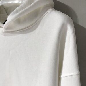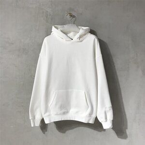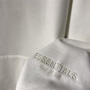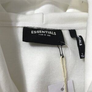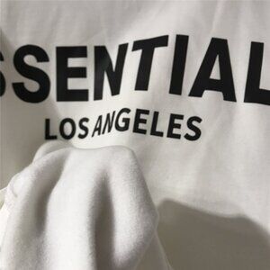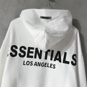 Loose hooded fit, white cotton fabric, with black "ESSENTIALS" and "LOS ANGELES" printed on the back for a prominent brand logo. The hooded design ensures practicality and a street style look.