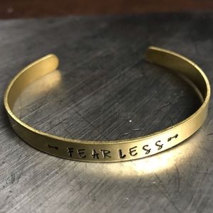 Hand stamped brass bangle bracelet. 6in in length with up to a 2in gap.