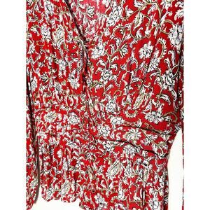 Feather Bone x Anthropologie Women's Latrobe V Neck Lace Up Smocked Peplum Long Sleeve Floral Blouse