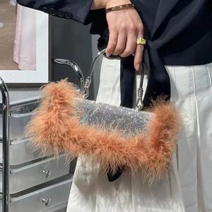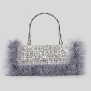 Beautiful rhinestone embellished handbag with feather boarder. Comes with chain shoulder strap