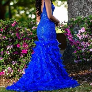 Embellished sparkly Royal Blue prom dress with feathers at the bottom, worn once in great condition.