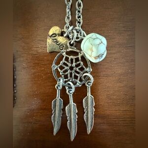 1. Silver Dreamcatcher Necklace – Features turquoise-style bead and “love” charm.