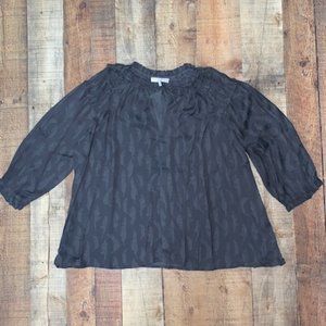 Light and flowing feather print with drawstring sinched tie and v-neck detail.