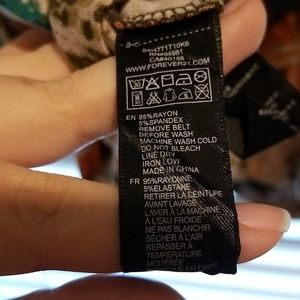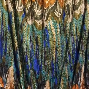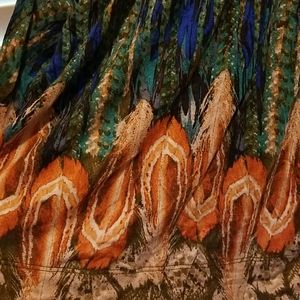 This dress has gorgeous colors worked into the feather pattern. There is elastic around the top and waist. There are belt loops so be sure to add your own belt. There are pockets too!