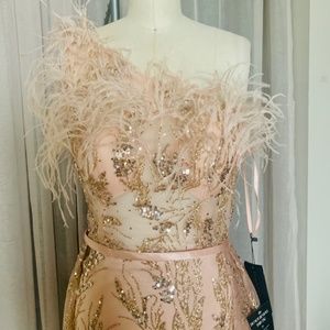 This rose gold gown features glitter and sequins for a memorable night with a feathered asymmetric neckline, a generous slit, and elegant silhouette. There is an invisible zipper closure, corseted bodice, and a horsehair train to keep it’s shape around the hem. This gown has never been worn, included are photos of the garment in it’s current condition. Please note the color slightly darker in person, as it is rose gold and some monitors may not represent the true color.