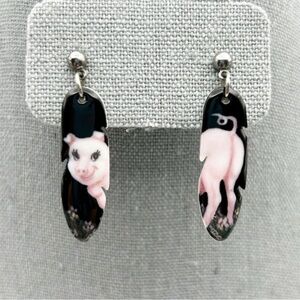 Feather Style Black Pig Fun Novelty Pierced Stud Dangle Porcelain Earrings