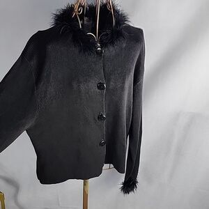 Feather Trimmed Black Knit Long Sleeved Button Cardigan Holiday Sweater