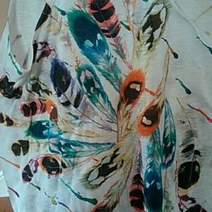 Such a cute racerback tank with a bursting feather design and shiny sequins. 100% polyester. Worn maybe twice and looks great with any outfit! Can be dressed up OR down! The size on the tag is S/P but doesn't seem to fit as a Petite, plenty long enough!