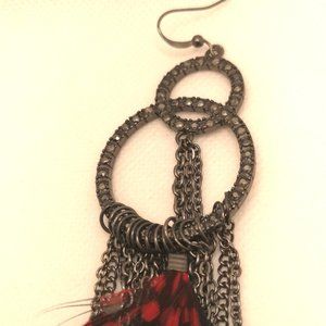 Gun metal grey hoop earrings set with rhinestones with pheasant feathers and chains hanging from them.