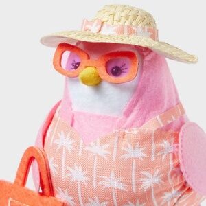• Pink fabric bird with peach palm tree print outfit, straw hat, peach/orange sunglasses and purse.