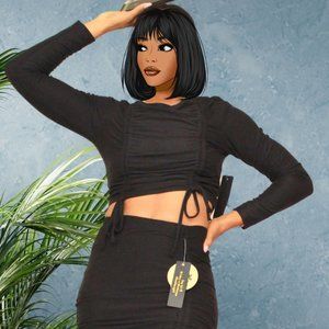Feathers- Black Ruched Fitted Crop Top % Skirt set - Medium