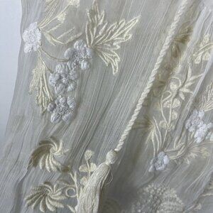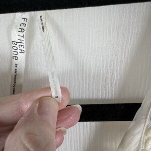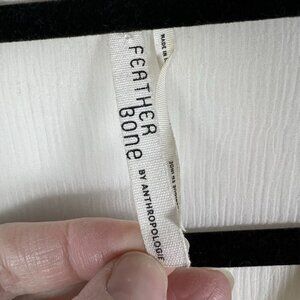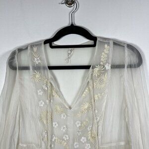 This is a Feathers Bone by Anthropologie boho blouse in ivory, featuring floral embroidered accents. It has a V-neckline, long sleeves, and a relaxed fit in a size small. The blouse is lightweight, sheer, and breathable, suitable for all seasons. Perfect for various occasions like travel, parties, casual outings, or workwear. The bohemian and peasant style adds a touch of unique flair to the garment. Hand wash only care instructions.