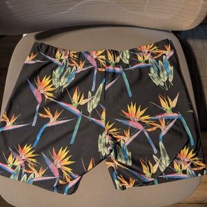 Stylish shorts with a vibrant birds of paradise pattern on a black base. Ideal for sports wear or casual wear size XL