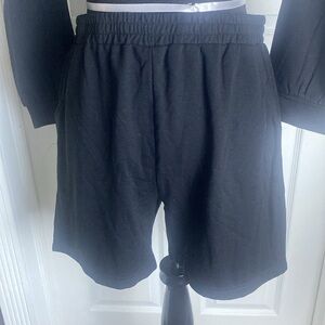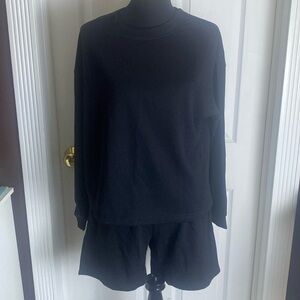 Feathers women’s pajamas loungewear. Long sleeve top and shorts. Black. Sz L. Light sweatshirt material. Shorts have wide elastic waistband and pockets. NWOT