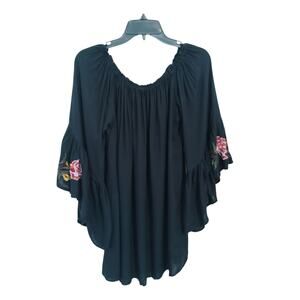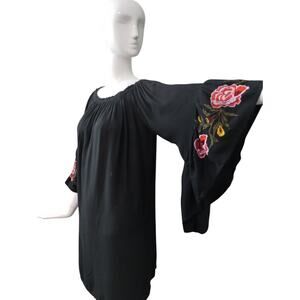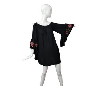 Feathers Women's size Large Embroidered Off The Shoulder Boho Flowy Hippie Dress Black Roses Floral Feminine Whimsical Whimsigoth Witchy Fairygoth Bell Sleeves Bohemian Beachy Comfy