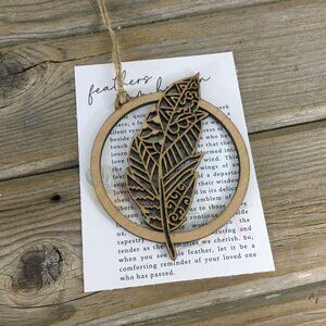 This Feathers from Heaven ornament makes a meaningful gift or a special addition to your own collection. Perfect for celebrating the holiday season with love and remembrance. Measuring 3.75" wide by 3.75" tall, this ornament is available in either a whitewashed finished wood or natural, unfinished cherry wood. Each ornament includes a printed story card, adding a unique and heartfelt element to the gift. Complete with twine for easy hanging.