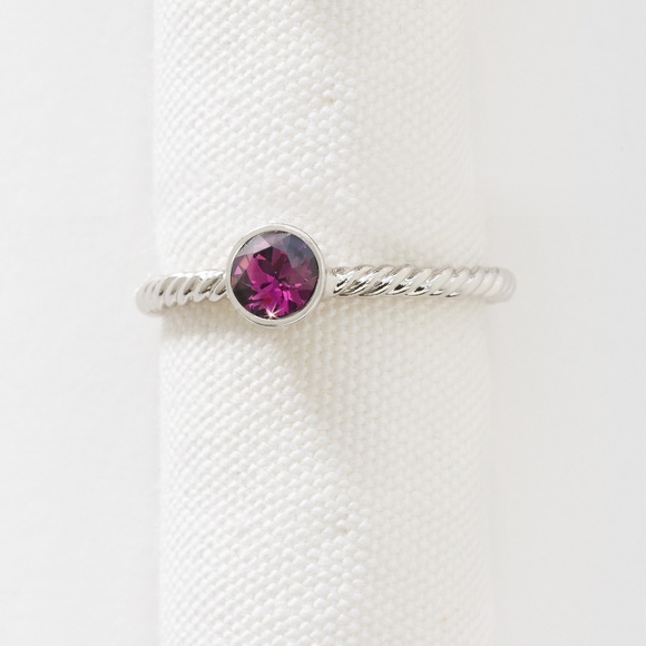 Our February Birthstone Ring features an Amethyst crystal; rhodium plating. Great for stacking!
