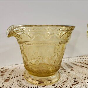 Vintage Federal Glass footed open sugar bowl and creamer set. Patrician yellow amber depression glass set. Excellent condition, no signs of use, was for display only. Produced between 1933 - 1937.
