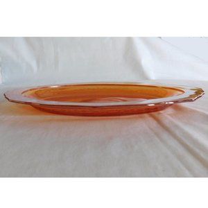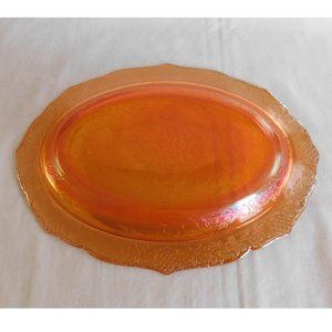 Oval serving platter, approximately 11 1/2 inches long, 8 1/2 wide, 1 inch tall. Federal Glass, Normandie pattern, also known as Bouquet and Lattice, Sunburst - an iridescent carnival glass finish, vintage item in good condition, no chips, no cracks, light use.