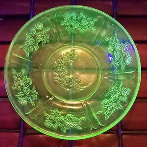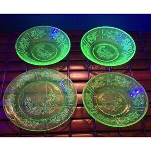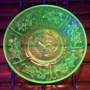 Federal Uranium Glass Sharon Cabbage Rose 3 Bowls & 1 Plate UV Reactive