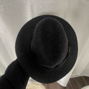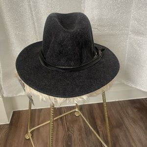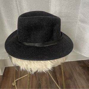 Gray fedora in pretty good condition only thing damage is leather band on it coming off which u can replace if you like…