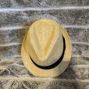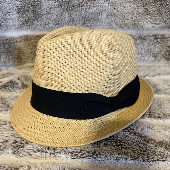 Tan fedora with black band featuring bow. Gently used. Excellent condition.