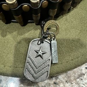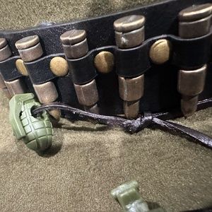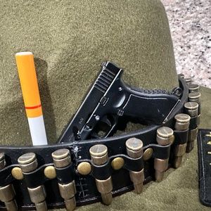 Fedora!!! 100% handmade fedora hat!!! Here you have an army green custom fedora. This hat made of felt material and is embraced with Army patch work. It features a mini metal pistol that gives the fedora its meaning. My hat also has a plastic cigarette that looks realistic. As shown in the photo there is a dog tag and a bullet belt that hugs this hat.This fedora was created from my fierce collection where NO 2 HATS ARE THE SAME!!!! It's yours if you are interested in taking this beauty home. THIS HAT WAS MADE, PACKAGED AND HAS NEVER BEEN WORN.