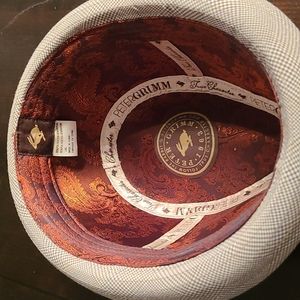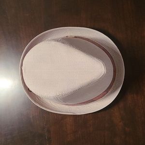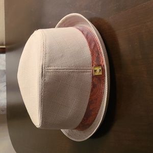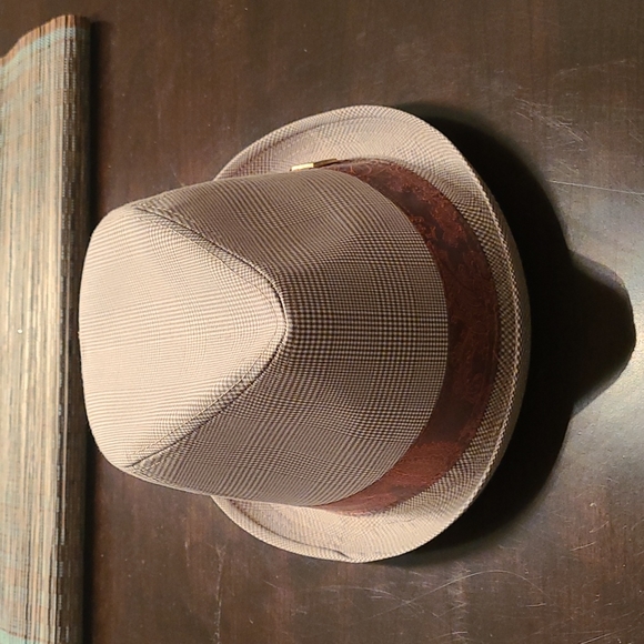 gray plaid fedora with jacquard fabric band in crimson. The size is L/XL. The condition is excellent.