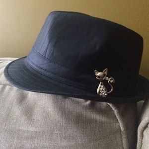 Pin striped Fedora with a cat pin. Looks very classy. Have worn it only once. Good look for any season.