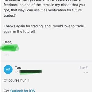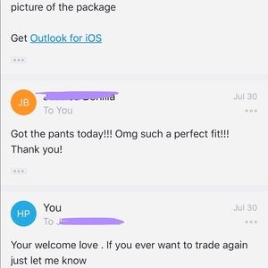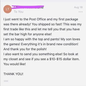 I love the stuff you and i trades for!! You are awesome and a quick Shipper! Look forward to trading again. Reminder : I need xl shirts