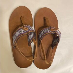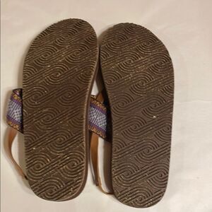 These sandals showcase a classic thong design with a rich brown footbed and a striking purple geometric strap. The woven pattern adds a bohemian flair, making them perfect for casual summer outings. Their zensole sole ensures comfort for everyday wear. Maybe worn one time.