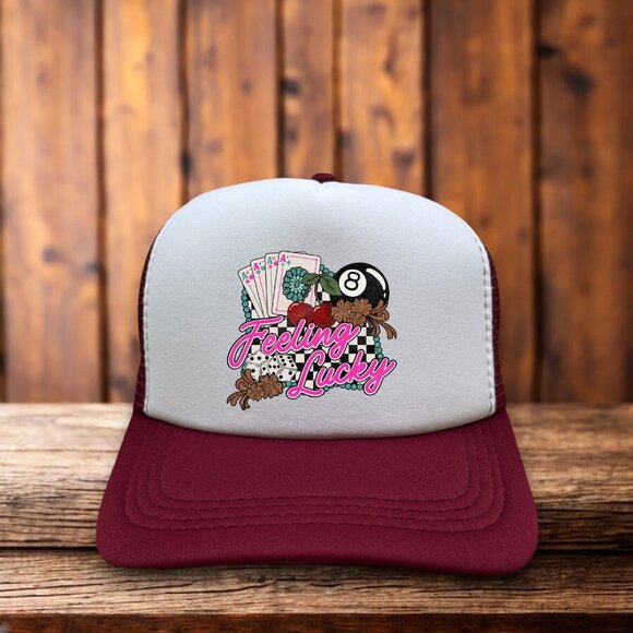 Feeling Lucky 8 Ball Unisex Trucker Hat Maroon Las Vegas Casino Poker Blackjack